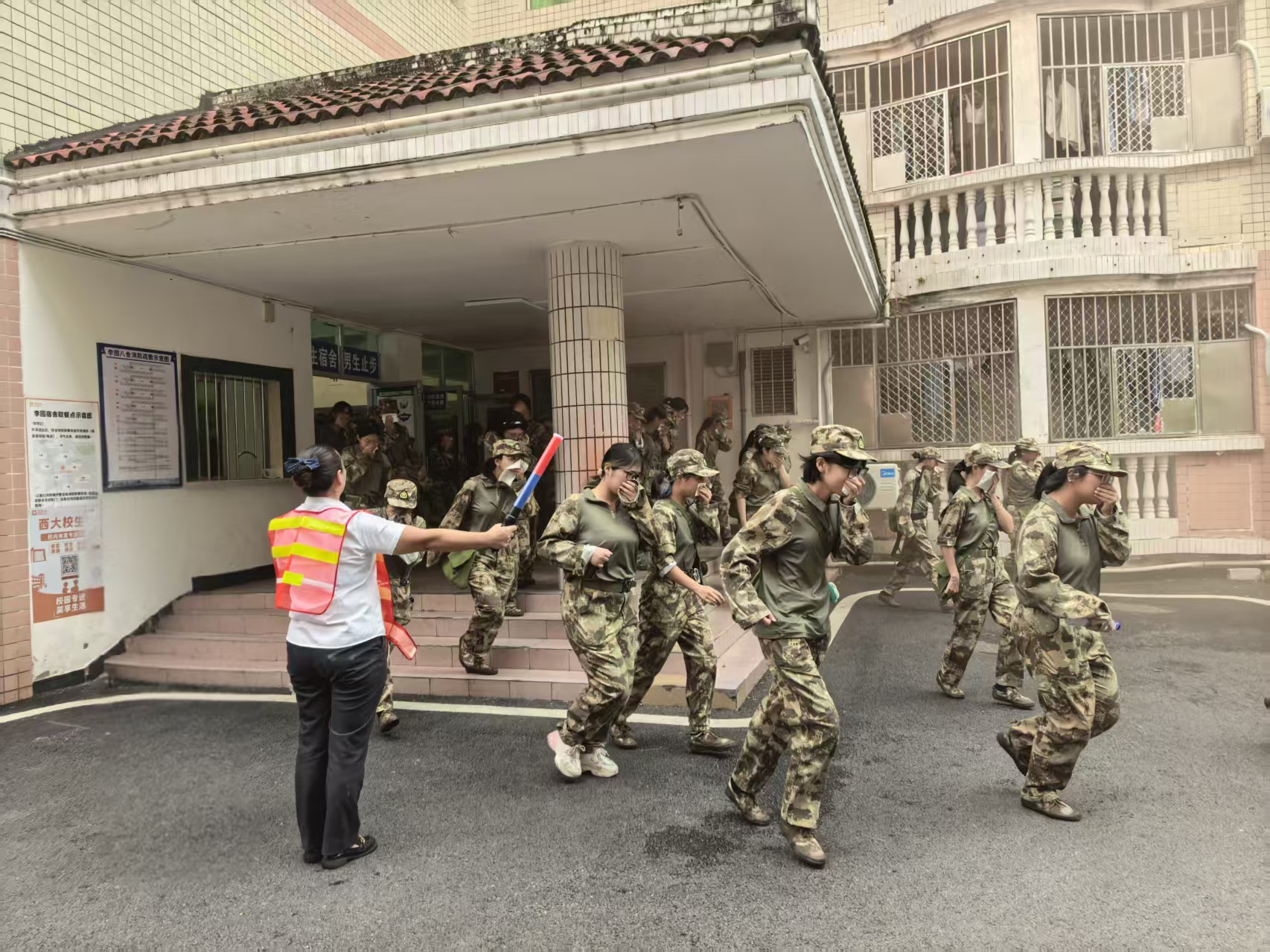 上午8时,随着各楼栋“演练开始”指令发出,各演练区域立即启动应急响应。宿舍值班人员模拟报告119火警电话和学校应急指挥中心,通知各楼栋学生自防自救组织成员到达指定楼层开展疏散。在楼内值班人员与辅导员的引导下,新生们迅速用湿毛巾捂住口鼻,弯腰低姿按照预设逃生路线快速有序疏散,仅耗时5分10秒全体人员安全集结至指定区域。随后,各学院辅导员逐一清点人数,确认无新生遗漏,并针对演练中“部分新生疏散速度较慢”“少数人未规范弯腰捂鼻”等细节问题现场点评,进一步强化新生安全意识。